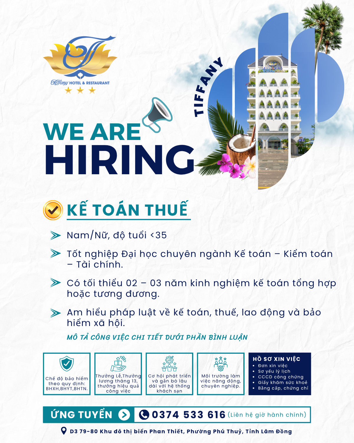 - - Địa điểm làm việc: KHÁCH SẠN TIFFANY - D3 79-80 Khu đô thị biển Phan Thiết, Phường Phú Thủy, Tỉnh Lâm Đồng.